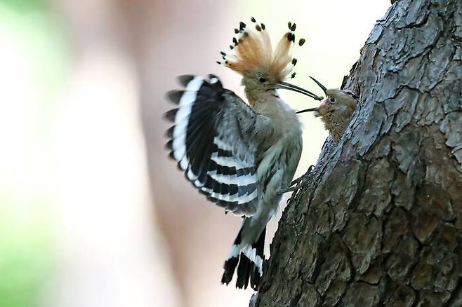 경북 경주에서 포착된 장면인데요, 후투티가 날개를 퍼덕이며 새끼에게 먹이를 주고 있네요.