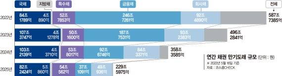 17일 코스콤에 따르면 연내 갚아야 하는 국내 채권 만기 규모는 587조원을 넘어간다. 오는 2023년에는 496조원, 2024년은 358조원, 2025년은 229조원 수준을 현금상환하거나 차환해야 한다.