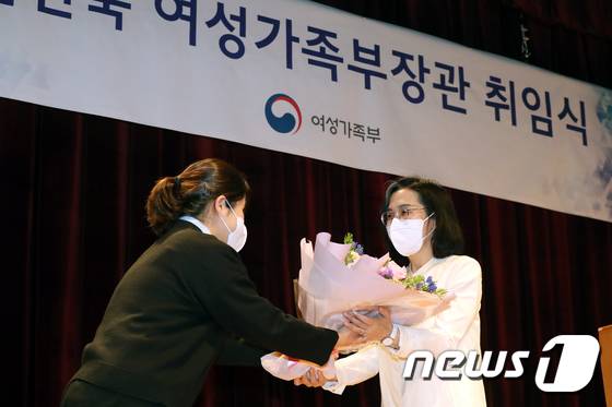 (서울=뉴스1) 민경석 기자 = 김현숙 신임 여성가족부 장관이 17일 오후 서울 종로구 정부서울청사에서 열린 취임식에서 축하 꽃다발을 받고 있다. 2022.5.17/뉴스1