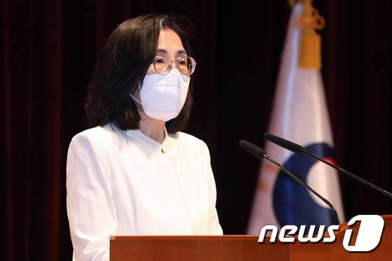 (서울=뉴스1) 민경석 기자 = 김현숙 신임 여성가족부 장관이 17일 오후 서울 종로구 정부서울청사에서 열린 취임식에서 취임사를 하고 있다. 2022.5.17/뉴스1