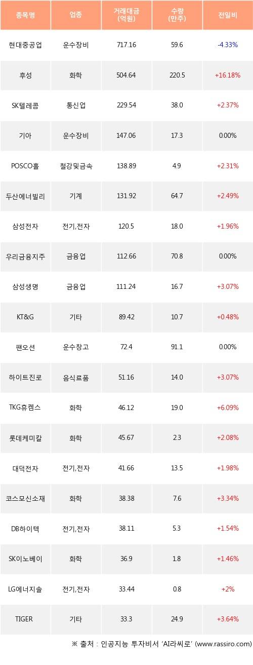 후성, SK텔레콤, POSCO홀딩스 등은 전일 대비 주가가 상승했고, 현대중공업 등은 주가가 하락했다.