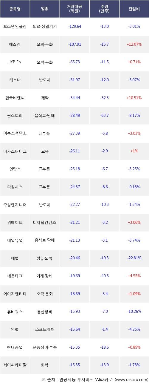 외국인 투자자의 순매도 상위 20개 종목은 오스템임플란트, 에스엠, JYP Ent., 테스나, 한국비엔씨, 팜스토리, 이녹스첨단소재, 메가스터디교육, 인탑스, 다원시스등이다.