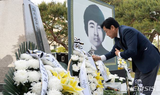 [전주=뉴시스] 김얼 기자 = 김관영 더불어민주당 전북도지사 후보가 17일 전북 전주시 전북대학교에서 열린 제42주년 5.18 민중항쟁 전북기념식 및 이세종 열사 추모식에 참석해 헌화를 하고 있다. 2022.05.17. pmkeul@newsis.com
