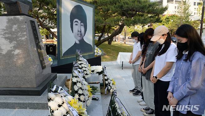 [전주=뉴시스] 김얼 기자 = 제42주년 5.18 민중항쟁 전북기념식 및 이세종 열사 추모식이 열린 17일 전북 전주시 전북대학교에서 학생들이 헌화를 마치고 묵념을 하고 있다. 2022.05.17. pmkeul@newsis.com