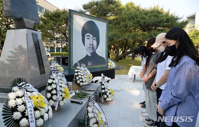 [전주=뉴시스] 김얼 기자 = 제42주년 5.18 민중항쟁 전북기념식 및 이세종 열사 추모식이 열린 17일 전북 전주시 전북대학교에서 학생들이 헌화를 마치고 묵념을 하고 있다. 2022.05.17. pmkeul@newsis.com
