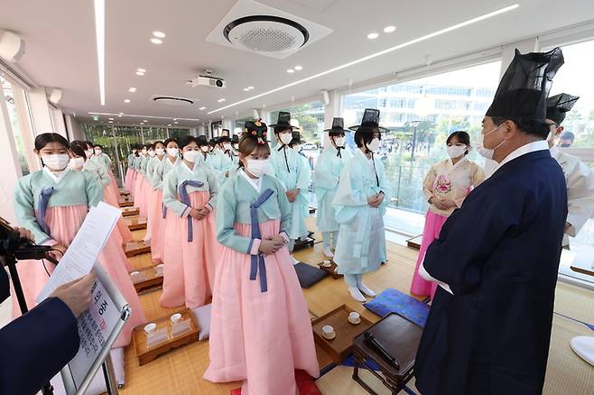 [부산=뉴시스] 17일 부산 금정구 부산대학교 운죽정에서 열린 '제24회 효원성년제'에 참가한 성년을 맞은 남녀 학생들이 한복을 입고 전통 의례를 치르고 있다. 부산대 효원성년제는 1999년부터 해마다 열리고 있다. (사진=부산대 제공) 2022.05.17. photo@newsis.com