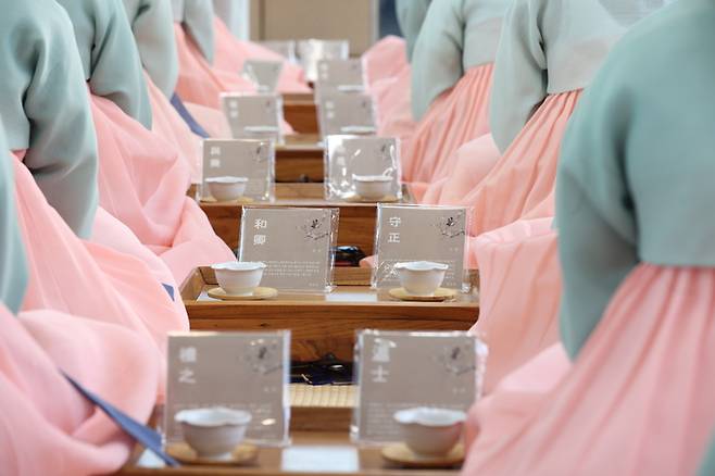 [부산=뉴시스] 17일 부산 금정구 부산대학교 운죽정에서 열린 '제24회 효원성년제'에 참가한 성년을 맞은 남녀 학생들이 한복을 입고 전통 의례를 치르고 있다. 부산대 효원성년제는 1999년부터 해마다 열리고 있다. (사진=부산대 제공) 2022.05.17. photo@newsis.com