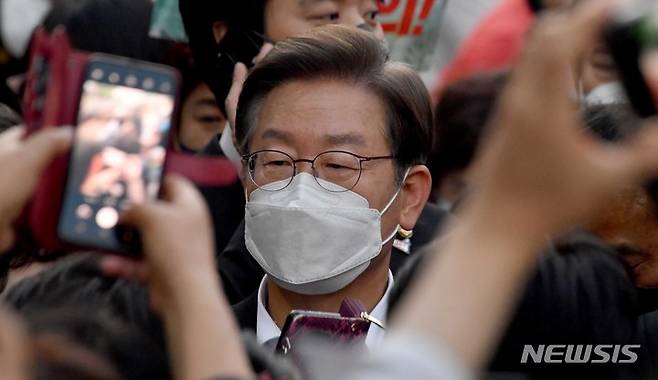 [광주=뉴시스] 변재훈 기자 = 이재명 더불어민주당 총괄 상임선대위원장이 17일 오후 광주 동구 금남로에서 제42주년 5·18민중항쟁 전야 행사 중 '민주평화대행진'에 참석해 지지자들과 기념 촬영을 하고 있다. 2022.05.17. wisdom21@newsis.com
