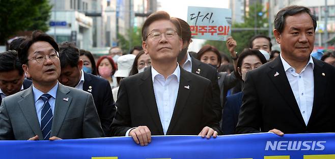 [광주=뉴시스] 김혜인 기자 = 이재명 더불어민주당 총괄 상임선대위원장이 17일 오후 광주 동구 금남로에서 제42주년 5·18민중항쟁 전야 행사 중 '민주평화대행진'에 참석해 지지자들과 기념 촬영을 하고 있다. 2022.05.17. hyein0342@newsis.com