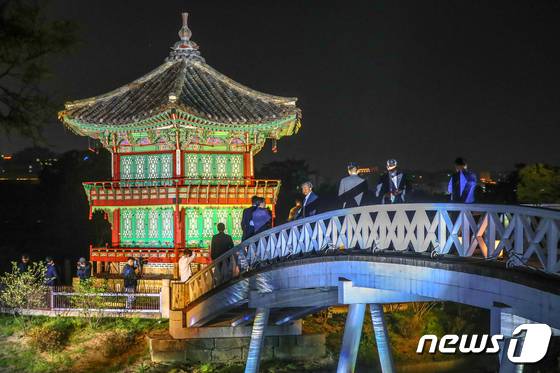 (서울=뉴스1) 민경석 기자 = 17일 오후 서울 종로구 경복궁에서 열린 '대한민국 최초 전기발상지 점등행사'에서 가로등 점등과 함께 향원정이 환하게 붉을 밝히고 있다. 2022.5.17/뉴스1