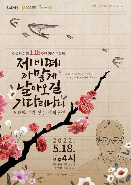 [아시아경제 박종일 기자] 성북구와 성북문화원이 18일 오후 4시 이육사 탄생 118주년 기념 문화제 ‘제비떼 까맣게 날아오길 기다리나니’를 개최한다.