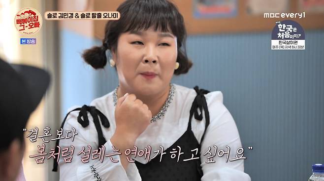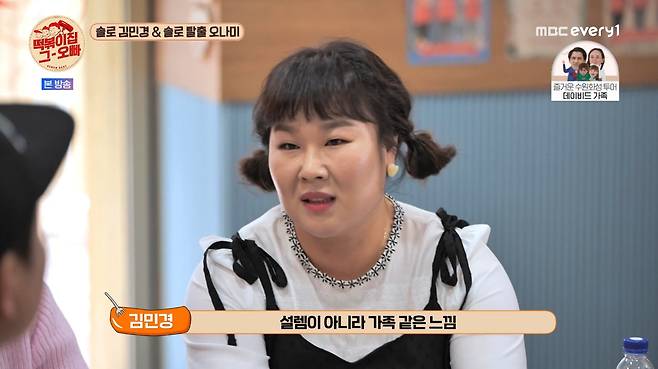 "주변에서 짝을 찾아봐라. 유민상, 송병철은 어떻냐?"는 질문에 김민경은 "너무 가까워서 오히려 누군가를 소개를 해주고 싶은 마음이다. 설렘보다 가족 같은 느낌"이라며 "연애는 하고 싶다. 하지만 결혼 목표가 아니고 설레는 연애를 하고 싶다. 그걸 원한다"고 말했다.