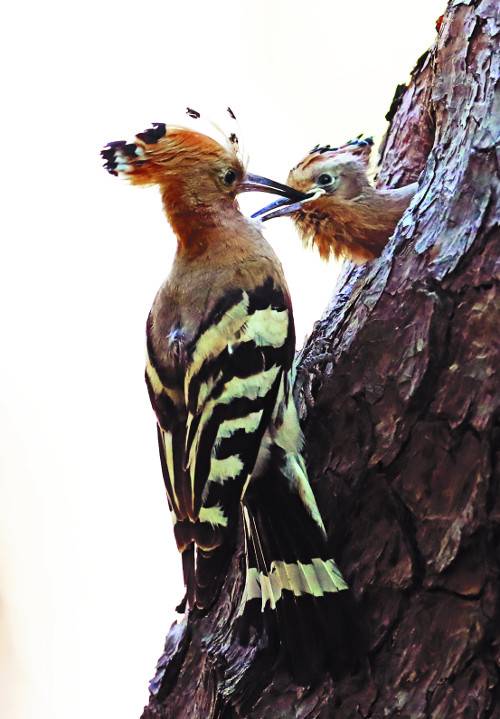 여름철새인 후투티가 17일 경북 경주시 황성동 황성공원의 한 나무 위에서 새끼에게 먹이를 주고 있다.