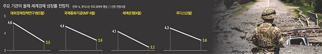글로벌 주요 기관들도 올해 세계경제 성장률 전망을 줄줄이 내리고 있다. 지난해 하반기까지 올해 세계경제 성장률 전망치를 4.9%로 유지하던 국제통화기금(IMF)은 올해 초 오미크론 변이가 확산하자 전망치를 4.4%로 낮췄고 지난달 전망에서는 3.6%로 내려잡았다. 지난해 12월 올해 세계경제 성장률을 4.5%로 제시했던 경제협력개발기구(OECD)는 지난 3월에 발표한 ‘중간 경제전망’에서 1%포인트 이상 하락할 수 있다고 내다봤다.
