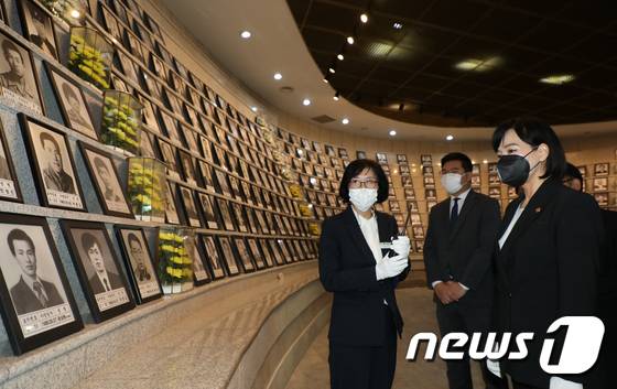 (서울=뉴스1) 민경석 기자 = 전현희 국민권익위원장이 17일 광주 북구 국립5·18민주묘지를 방문해 5월 민주영령의 영정사진이 모셔진 유영봉안소를 둘러보고 있다.(국민권익위원회 제공) 2022.5.17/뉴스1