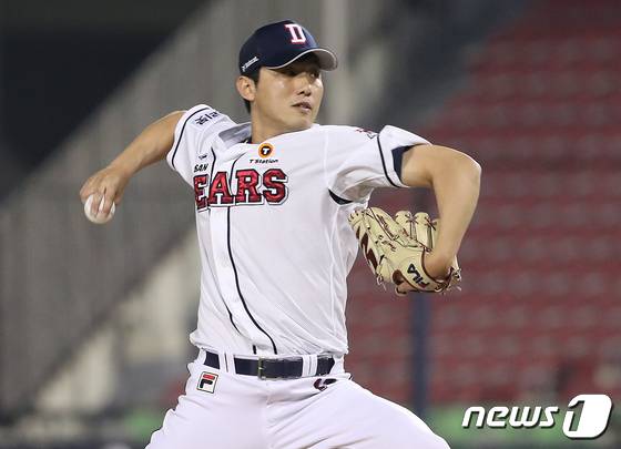 (서울=뉴스1) 김진환 기자 = 17일 오후 서울 송파구 잠실야구장에서 열린 프로야구 '2022 신한은행 SOL KBO리그' SSG랜더스와 두산베어스의 경기, 두산 홍건희가 11회초 등판해 힘차게 공을 던지고 있다. 2022.5.17/뉴스1