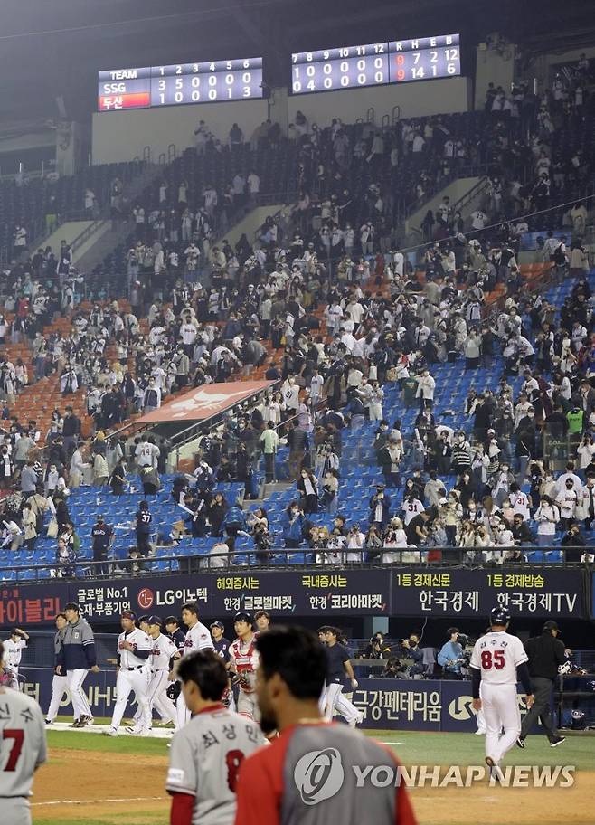 (서울=연합뉴스) 한종찬 기자 = 17일 오후 서울 송파구 잠실야구장에서 열린 2022 프로야구 두산 베어스 대 SSG 랜더스의 경기. 양팀 선수들이 팬들에게 인사하기 위해 그라운드로 향하고 있다. 2022.5.17