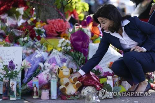 New York Gov. Kathy Hochul looks at a memorial at the scene of a shooting at a supermarket as she pays respects to the victims of Saturday's shooting in Buffalo, N.Y., Tuesday, May 17, 2022. (AP Photo/Andrew Harnik)