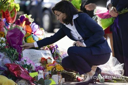 New York Gov. Kathy Hochul looks at a memorial at the scene of a shooting at a supermarket as she pays respects to the victims of Saturday's shooting in Buffalo, N.Y., Tuesday, May 17, 2022. (AP Photo/Andrew Harnik)
