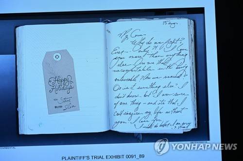 epa09952882 Evidence showing notes from US actress Amber Heard appear on a screen during the Depp vs Heard defamation trial at the Fairfax County Circuit Courthouse in Fairfax, Virginia, USA, 17 May 2022. US actor Johnny Depp's 50 million US dollar defamation lawsuit against his ex-wife, US actress Amber Heard, started on 10 April. EPA/BRENDAN SMIALOWSKI / POOL