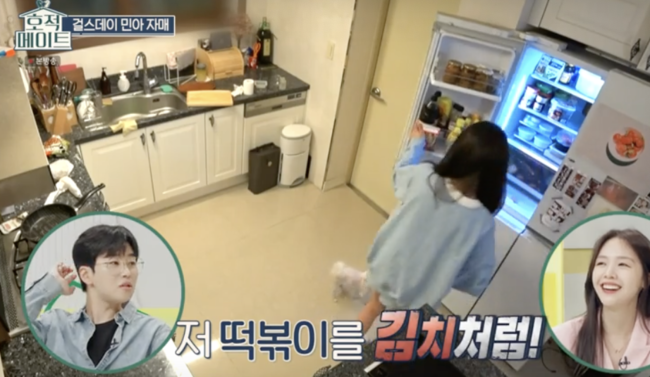 집으로 이동했다. 언니는 떡볶이 하나를 큰 거 시켜서 7번을 나눠먹는다고. 방민아는 “잘 안 버린다”며 답답해했다. 본인이 청소담당이라는 것. 언니는 서둘러 남은 떡볶이를 이용해 짜파게티와 섞은 요리를 만들 것이라 했고, 남은 떡볶이를 다시 냉장고에 넣자 딘딘은 “거의 떡볶이를 김치처럼 먹는다”고 말해 폭소하게 했다.