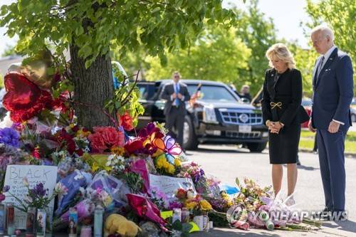 President Joe Biden and first lady Jill Biden pay their respects to the victims of Saturday's shooting at a memorial across the street from the TOPS Market in Buffalo, N.Y., Tuesday, May 17, 2022. (AP Photo/Andrew Harnik)