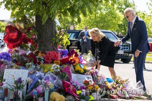 President Joe Biden and first lady Jill Biden pay their respects to the victims of Saturday's shooting at a memorial across the street from the TOPS Market in Buffalo, N.Y., Tuesday, May 17, 2022. (AP Photo/Andrew Harnik)