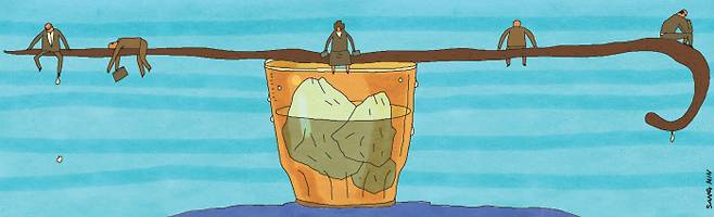 인간이 지구의 주인으로 등극한 지난 1~2세기, 문명화 논리와 과학의 발달은 인간 조건의 균형을 깨뜨렸다. 위스키의 얼음은 녹는 게 자연스럽다. 이 이치를 인정할 때, 지구상의 얼음이 녹지 않는다. 만물의 영장을 자처한 인간 때문에 인구 증가, 불평등, 극단의 양극화와 함께 얼음이 정말로 급격히 녹기 시작했다. 남극과 북극의 얼음이 녹으면서 일어나는 현상이야말로 완벽한 글로벌라이제이션이다. 물은 지구에서 가장 강력한 물질이다. 이 현상은 물을 매개하기 때문에, 전 세계 곳곳에 예외 없이 스며든다. “물 샐 틈 없이”가 언제나 안보 담론과 짝을 이루는 이유다.