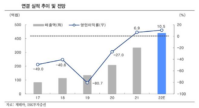 제테마의 매출액은 2017년 80억원 → 2018년 110억원 → 2019년 130억원 → 2020년 210억원 → 지난해 332억원 순으로 고속 성장을 이어왔다. 이중 필러 매출액은 지난 2020년 141억원, 지난해 223억원으로 급증했다.
