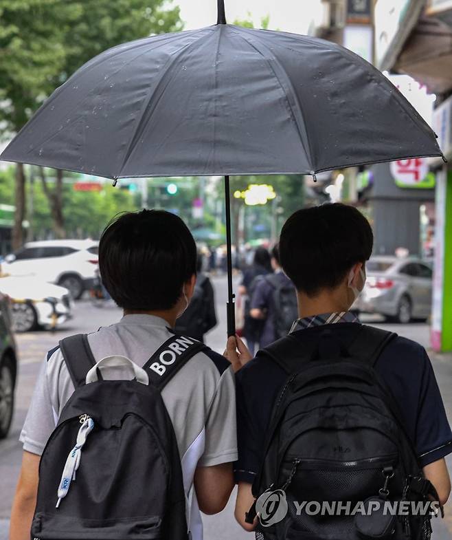 (서울=연합뉴스) 황광모 기자 = 서울 지역에 소나기가 내린 18일 오전 서울 송파구의 한 도로에서 학생들이 나란히 우산을 쓰고 등교하고 있다. 2022.5.18