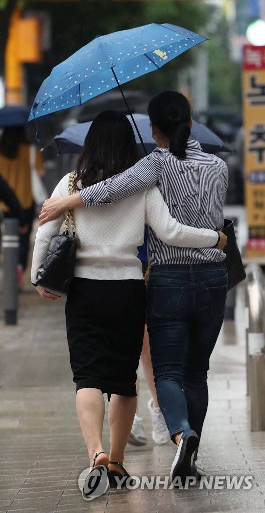 (서울=연합뉴스) 류영석 기자 = 서울에 소나기가 내리는 18일 오전 서울 서초구 지하철 교대역 인근에서 시민들이 우산을 쓴 채 길을 건너고 있다. 2022.5.18
