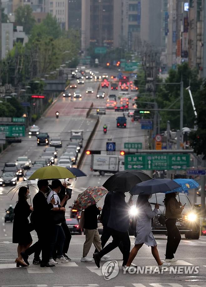 (서울=연합뉴스) 류영석 기자 = 서울에 소나기가 내리는 18일 오전 서울 서초구 지하철 교대역 인근에서 시민들이 우산을 쓴 채 길을 건너고 있다. 2022.5.18