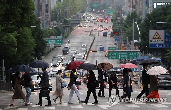 (서울=연합뉴스) 류영석 기자 = 서울에 소나기가 내리는 18일 오전 서울 서초구 지하철 교대역 인근에서 시민들이 우산을 쓴 채 길을 건너고 있다. 2022.5.18