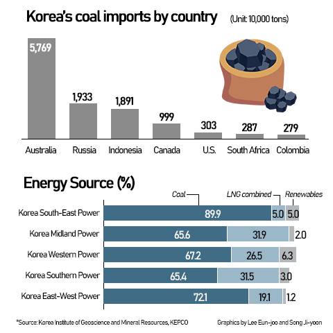 According to Korea Institute of Geoscience and Resources, Korea imported 57.69 million tons of bituminous coal from Australia last year, followed by 19.33 million tons from Russia, 18.91 million tons from Indonesia, 9.99 million tons from Canada, 3.03 million tons from the United States, 2.87 million tons from South Africa, and 2.79 million tons from Colombia.