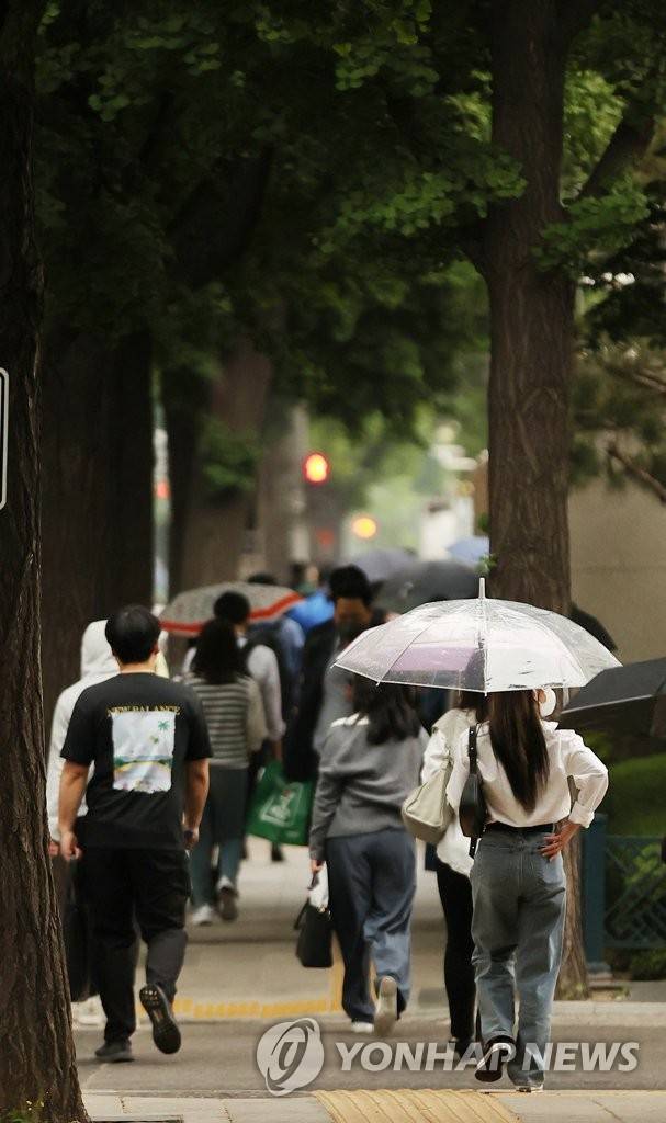 (서울=연합뉴스) 서대연 수습기자 = 소나기가 내린 18일 오전 서울 종로구 광화문역 인근에서 출근하는 시민들이 우산을 쓰고 있다. 2022.5.18