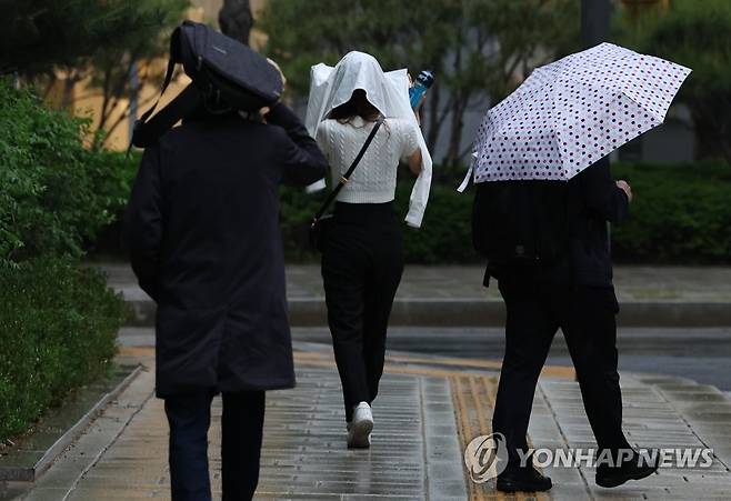 (서울=연합뉴스) 홍해인 기자 = 서울 지역에 비가 내린 18일 오전 서울 종로구 세종문화회관 부근에서 가방과 옷으로 머리를 가린 채 출근하는 시민들 옆으로 우산을 쓴 시민이 지나가고 있다. 2022.5.18