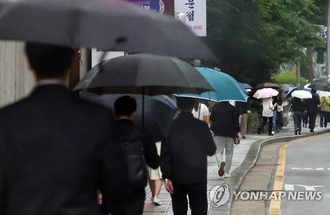 (서울=연합뉴스) 홍해인 기자 = 서울 지역에 비가 내린 18일 오전 서울 종로구 세종문화회관 부근에서 시민들이 우산을 쓴 채 출근하고 있다. 2022.5.18