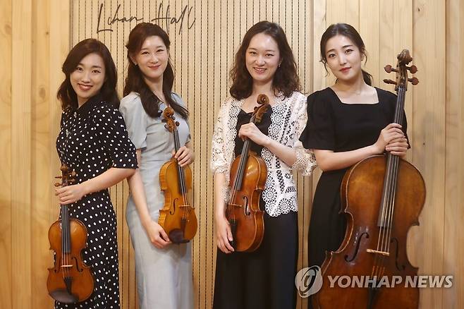 (서울=연합뉴스) 진연수 기자 = 현악사중주단 에스메 콰르텟이 지난 17일 서울 서초구 리한아트홀에서 연합뉴스와 인터뷰에 앞서 포즈를 취하고 있다. 왼쪽부터 배원희, 하유나, 김지원, 허예은. 2022.5.18