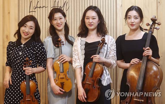 (서울=연합뉴스) 진연수 기자 = 현악사중주단 에스메 콰르텟이 지난 17일 서울 서초구 리한아트홀에서 연합뉴스와 인터뷰에 앞서 포즈를 취하고 있다. 왼쪽부터 배원희, 하유나, 김지원, 허예은. 2022.5.18
