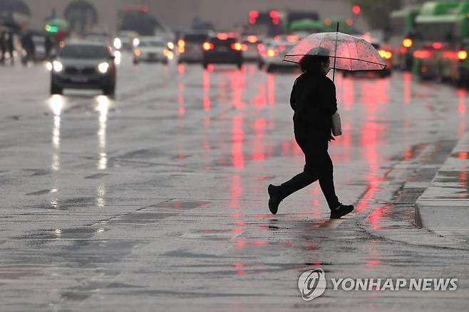(서울=연합뉴스) 이지은 기자 = 비가 내린 18일 오전 서울 광화문사거리에서 한 시민이 우산을 쓴 채 횡단보도를 건너고 있다. 2022.5.18
