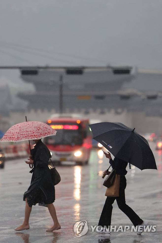 (서울=연합뉴스) 이지은 기자 = 비가 내린 18일 오전 서울 광화문사거리에서 시민들이 우산을 쓴 채 횡단보도를 건너고 있다. 2022.5.18