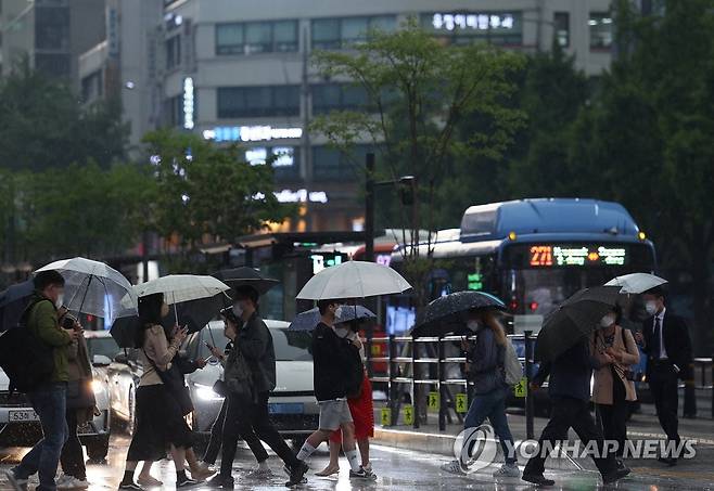 (서울=연합뉴스) 이지은 기자 = 비가 내린 18일 오전 서울 광화문사거리에서 시민들이 우산을 쓴 채 횡단보도를 건너고 있다. 2022.5.18