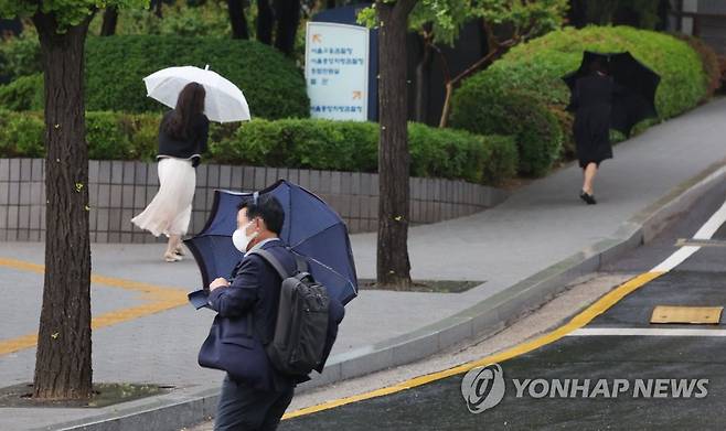 (서울=연합뉴스) 류영석 기자 = 서울에 소나기가 내리는 18일 오전 서울 서초구 서울중앙지방검찰청에서 우산을 쓴 직원들이 바람을 맞고 있다. 2022.5.18