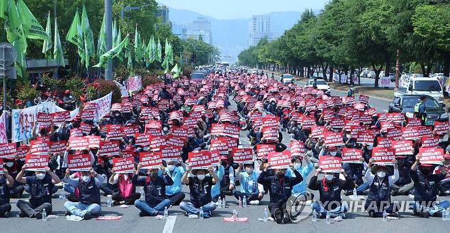 (창원=연합뉴스) 한지은 기자 = 전국건설노동조합 경남건설기계지부 레미콘지회가 18일 경남도청 앞에서 열린 총파업 결의대회에서 손피켓을 들고 있다. 2022.5.18