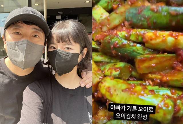 박지연은 18일 자신의 SNS 스토리에 "아빠가 기른 오이로 오이김치 완성"이라고 올렸다.