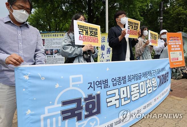 (서울=연합뉴스) 박동주 기자 = 아르바이트 노동조합 관계자들이 18일 오전 서울 국회 앞에서 '지역별, 업종별 최저임금 차등적용 근거 조문 삭제를 위한 국회 국민동의청원 기자회견'을 하고 있다. 2022.5.18