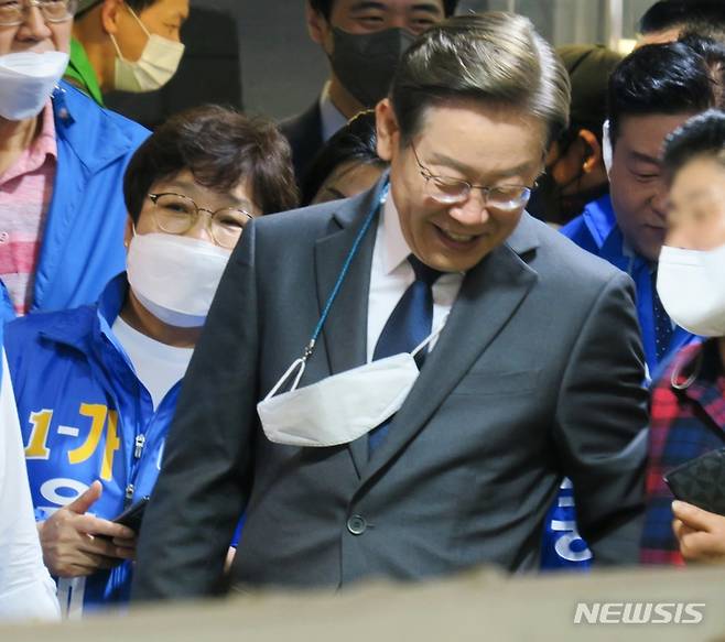 [인천=뉴시스] 김동영 기자 = 제8회 전국동시지방선거와 함께 치러지는 인천 계양을 국회의원 보궐선거에 출마한 더불어민주당 이재명 후보 겸 총괄선거대책위원장이 18일 오전 인천 동구 현대시장을 찾아 시민들과 인사를 나누고 있다. 2022.05.18. dy0121@newsis.com