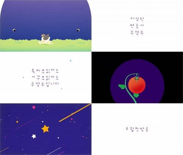 제작진이 공개한 1차 티저 영상은 ‘우영우’를 시작으로 그 이름처럼 똑바로 읽어도 거꾸로 읽어도 똑같은 단어들이 이어진다. ‘기러기’가 날아오른 자리에 ‘토마토’가 열리고, 그것을 집어삼킨 고래 뱃속은 다시 넓은 우주가 되고 별이 된다. 바다로 떨어지는 ‘별똥별’을 삼킨 고래에 이어 “똑바로 읽어도 거꾸로 읽어도 우영우입니다”라며 자신을 소개하는 우영우의 목소리는 궁금증을 더한다. 연관성 없어 보이는 단어들이 어우러져 하나의 세상을 만들고, 이를 바라보는 고래의 시선은 흥미롭다. 이렇듯 사람들에게 당연한 세상은 우영우에겐 낯설고 어렵다. 자신만의 방식으로 한계를 극복하고, 새로운 시각으로 사건을 바라보며 해결해 나가는 우영우의 성장기가 어떻게 그려질까.