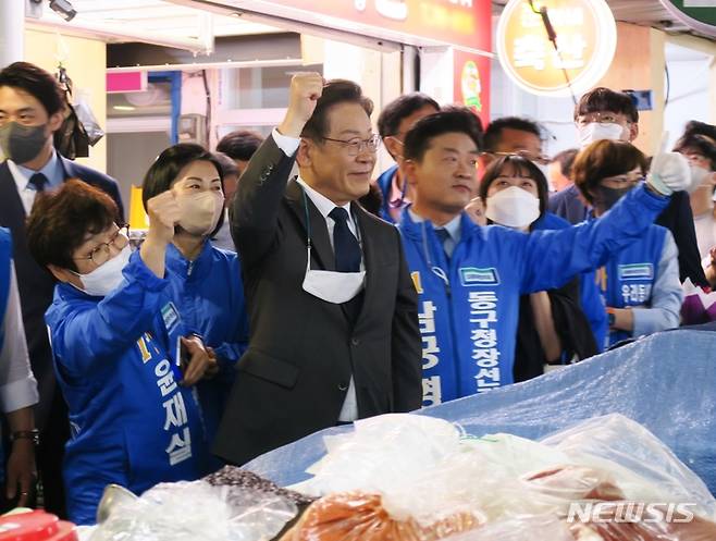 [인천=뉴시스] 김동영 기자 = 제8회 전국동시지방선거와 함께 치러지는 인천 계양을 국회의원 보궐선거에 출마한 더불어민주당 이재명 후보 겸 총괄선거대책위원장이 18일 오전 인천 동구 현대시장을 찾아 시민들과 인사를 나누고 있다. 2022.05.18. dy0121@newsis.com
