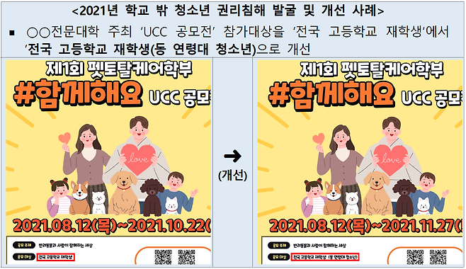 김권영 여성가족부 청소년정책관은 “여성가족부는 지속적으로 학교 밖 청소년 권리침해 사례를 발굴․개선해 나갈 예정”이라며, “학교에 다니지 않는다는 이유만으로 차별을 받아서는 안 되며, 공정한 성장의 기회를 얻는 사회를 만들기 위해 더욱 노력하겠다.”라고 말했습니다.
